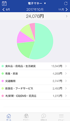 CRECOでは、クレジットカード利用明細について、その「カテゴリー」をユーザーが自ら選択することで、月々の利用傾向がわかると同時にCRECOポイントも貯まるという仕組みを導入しています。今回のアップデートでは、この仕組みを電子マネーまで広げています。さらに、クレジットカード・電子マネーに対して選択したカテゴリーをグラフで表示することで、より直感的に利用傾向が把握できるようになりました。