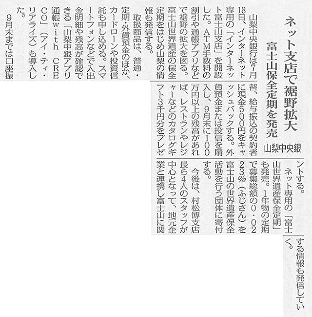 山梨中央銀「ネット支店で視野拡大 富士山保全定期を発表」の記事が掲載されました